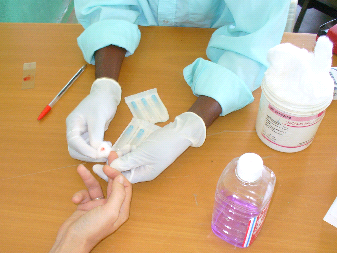 All they need is one drop on the slide, which is dipped first in blue food colouring and then red, to disguise the red corpuscles and illuminate the parasite chromatin. Then it’s time to look through the microscope.
