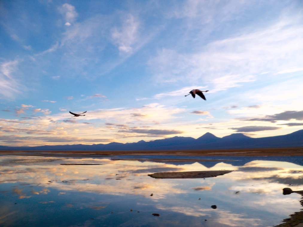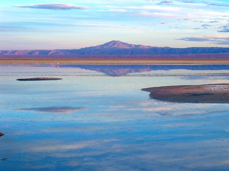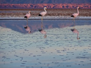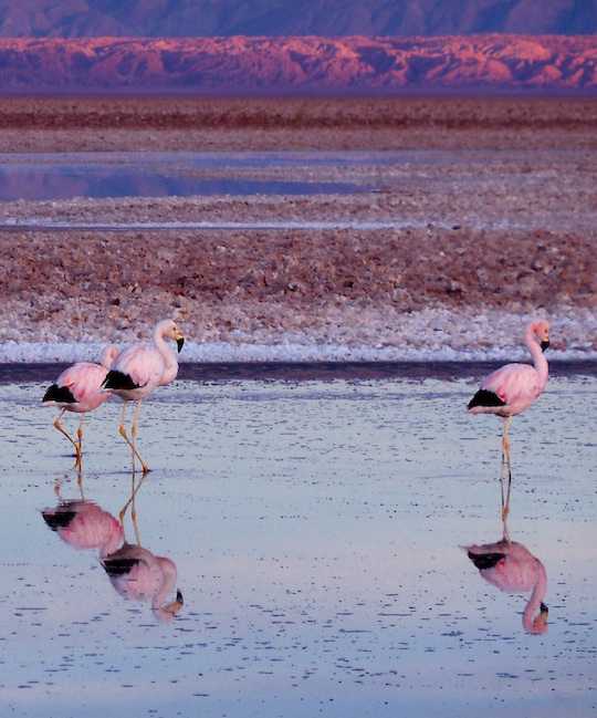 The salt flats here are a different story. The salt lakes harbour brine shrimp, which feed on algae that are full of betacarotene and able to survive the harsh conditions. The shrimp, in turn, are dinner for three different species of flamingo (‘flamenco’ in Spanish), which complete the bizarre picture. We visit the salt lakes at sunrise, intensifying the pinks and creating a wonderfully surreal scene.