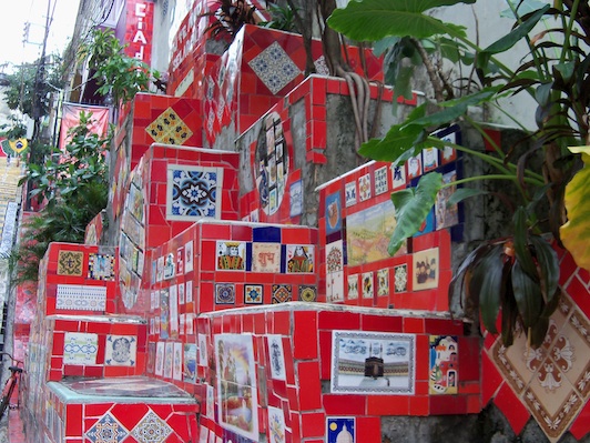 Leaving the main street, we are immediately ensconced in a labyrinth of winding alleyways and paths that lead up steep stairs through houses and out the other side. It’s too narrow for vehicles here and we step gingerly over garbage and dog shit trying to keep our feet as dry as possible. I’m glad now of Marcio in this maze of paths. Every passerby greets us with a smile or wave, music is everywhere, kids tag along for a while and cats stalk us. We stop at a grocery store to buy fresh pastries – they’re more expensive up here than in the main city, but local people can buy everything on credit, which is the only way to do business in a favela where people have fragile incomes.