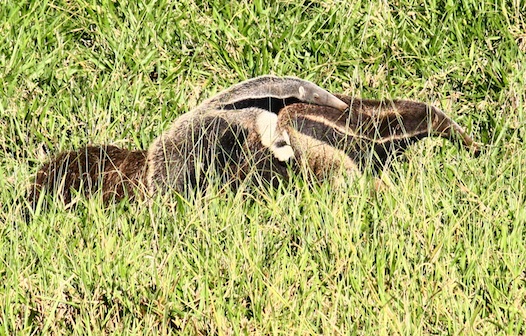 Sissor-tailed night hawks take flight as we approach and a barn owl – same as in Asia, Europe, Africa – turns and stares. We see small deer lying in a rice field and a couple of giant anteaters bumbling past, one of which is carrying two babies on her back – a very rare occurrence. Anteaters are strange creatures. They have no teeth and, with sloths, armadillos and aardvarks, belong to an ancient group of mammals with some bizarre characteristics. Giant anteaters have extremely strong forearms which allow them to break in minutes a termite mound that would take a man several hours. But they have poor hearing, poor eyesight and are very vulnerable to traffic because they respond so slowly. We see a few carcasses on our road into the Pantanal from Campo Grande city and there are less than 5000 left in the wild.