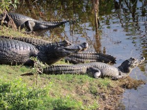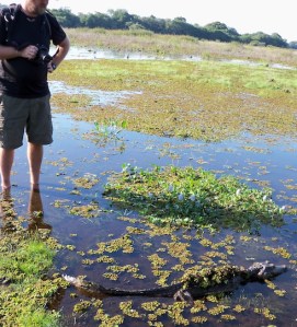 Now, though, jaguars are endangered – classed by CITES as ‘near-threatened’ (threatened with extinction in the near future). Deforestation and human encroachment has reduced their habitat to a few pockets of which the biggest are the Amazon and Pantanal in Brazil, and even there, numbers may be as low as 5 jaguars per 100 km2, although there is no reliable census. The biggest threat to jaguars here in the Pantanal is the cattle ranchers, or rather, the jaguar hunters that many ranchers illegally employ to kill the big cats. Cattle ranching began here 250 years ago and is the most important business in the Pantanal, where cattle are now the most numerous mammals. It turns out that humans are not the only carnivores in the area that enjoy beef, and the ranchers respond to the jaguar threat by shooting the cats. Often this s done by chasing the animal out of the jungle with dogs, surrounding it and then shooting it from close range with a 12 gauge shotgun.