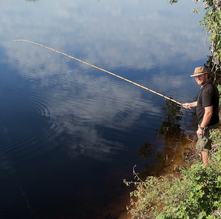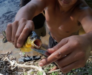 Next day, we’re up and out on the river in a boat looking for giant otters and finding dozens of crazy birds from toucans to blue macaws. We stop to watch capuchin monkeys and then some rather impolite howler monkeys who, in the interspecies diplomacy equivalent of Iran vs the US, begin throwing their shit at our heads. We move past them in a dignified silence and take up position on the river bank, where Nick does a bit of piranha fishing.