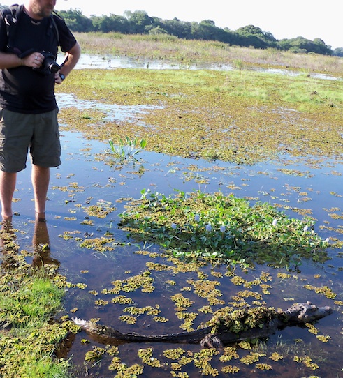 I leave Henrique to his lab full of poo and head out into the night to search for America’s biggest cat. The Pantanal, covering nearly 200,000 square kilometres, is the the world’s largest wetland and extraordinarily abundant in wildlife. Unlike in rainforests, you can actually see the animals here, especially during the dry season – now – when less of the vast swampy basin is submerged. We head out in a jeep with a powerful torch that ignites eyeshine in the drainage ditches and rivers, switching on an array of hundreds of red ‘lights’ as the caiman reflect the torchlight like candles floating on the Ganges at Varanasi. There are millions of caiman jostling for space in the water and crowding the banks.
