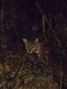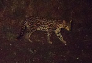 And then, a little further along the road, we spot an ocelot! It’s a beautiful cat, known as the ‘painted leopard’ for its wonderful markings that are similar to those of the clouded leopard. It stalks the bank like a very large domestic cat on the prowl, ears flickering in response to tiny sounds we don’t hear and it’s tail held aloft. Then, just as it pounces, we spot another one. The two chase each other and, with large paws, play-fight in the bushes before slinking away.