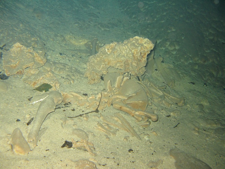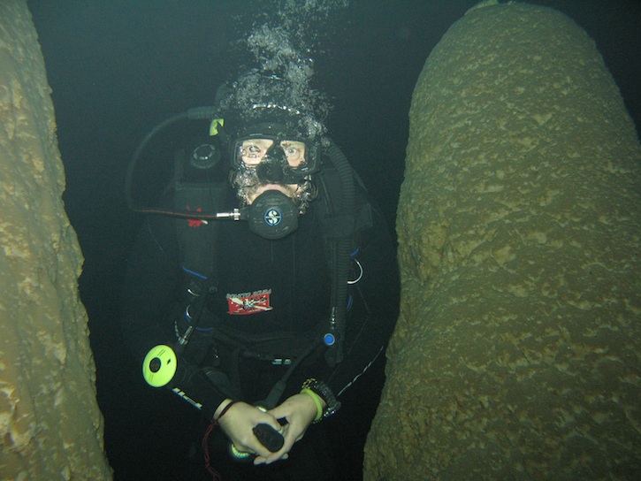 The water is freezing cold, clear and dark. Shining our dive torches produces a bright spotlight that shrouds everything else in deeper gloom, so I keep it off and let my eyes welcome in the edges. We float 20 metres down through golden cones of stalagmites, trying not to bump them and disturb their perfect preservation. An anteater skeleton lies where it died, stumbling over the hole’s edge 100 metres up.