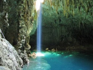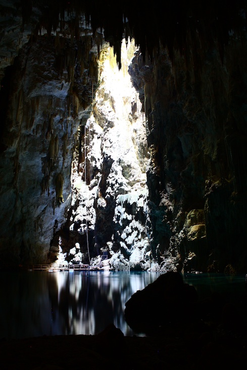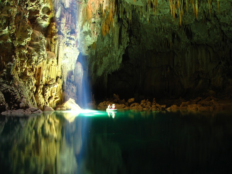 We reach the bottom eventually and stand in a vast subterranean cave on a small wooden platform that floats on the lake. It’s eerily beautiful and once our eyes adjust to what little light penetrates from the thin shaft, we begin to make out stalagmites and stalactites decorating every portion. This is the Anhumas Abyss, a natural architectural wonder formed over millions of years from rain slowly eroding the limestone here and building up crystals of calcium carbonate.