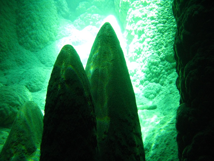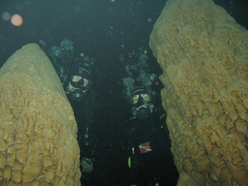 The water here is incredibly clear (to 50 metres in summer sunlight) and peering down past the reflections of stalactites we see their opposites growing from the cave floor. These are the world’s biggest cave stalagmites – the tallest is 19.5 metres high – and we change quickly into wetsuits, eager to see them up close.