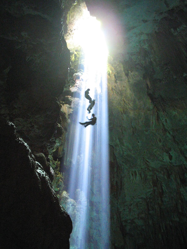 Nick is definitely more comfortable with our slow slide down to oblivion but because we’ve been ‘safety-tied’ together, I make him wait for me while I nervously release the rope brake. We had rappelling lessons last night on a gym wall, but that was easy peasy – a short few metres in a nicely lit hall before we nonchalantly signed our lives away. Hanging on a rope through a fissure in the rock the height of a 25-storey-building turns out to be a rather different experience. We’re halfway down when I notice a disquieting burning smell coming from the pulley I’m gripping as the rope slides through. Nick notices it too.