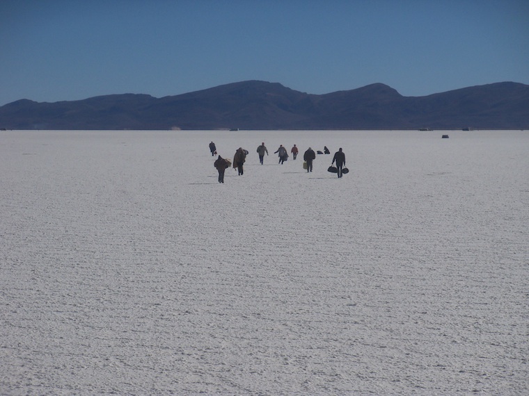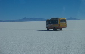 Our changed route takes us back across the salar, treating us to a second look at the incredible ocean of salt that fills the southwest corner of Bolivia. We drive slowly in the tracks made by other vehicles in the blank emptiness of white that stretches to the horizon on either side. We are an hour or so into our journey, when the bus pulls to a stop in the middle of the barren plain. From the windows we see the unbelievable sight of people running towards us holding suitcases. Where did they come from? It’s as surreal as if they had been dropped from a spaceship.