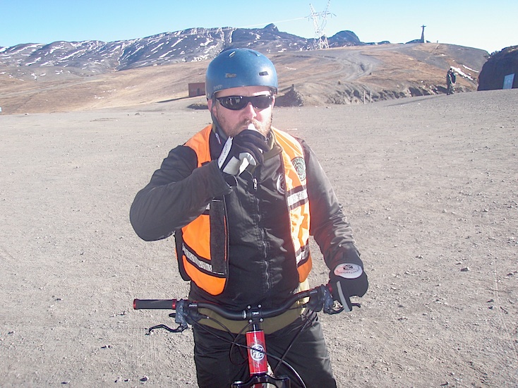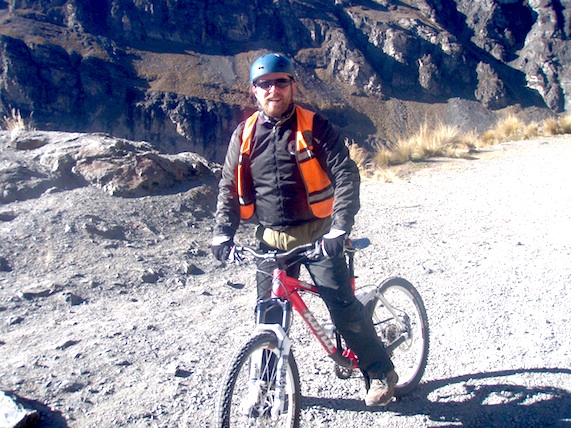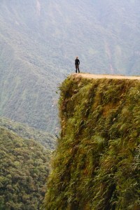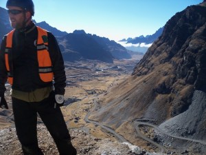 So it’s with no little apprehension that I find myself astride a mountain bike, 4700 metres up at La Cumbre, the start of The World’s Most Dangerous Road. Nick’s bouncing happily on his bike, talking about dual suspension and disc brakes and other technical stuff, while I’m trying to work out which way round my helmet goes on. Even I can see these are good bikes, though. They have nice fat tyres (fully pumped), the brakes work well and they have gears that don’t require my cycling backwards to engage them. Plus we have two enthusiastic blond Americans to guide us, who are cheerful in a way that only young Americans can be, and even though they ride this route every day, it seems churlish to deny them today’s fun by wimping out before we’ve even begun.