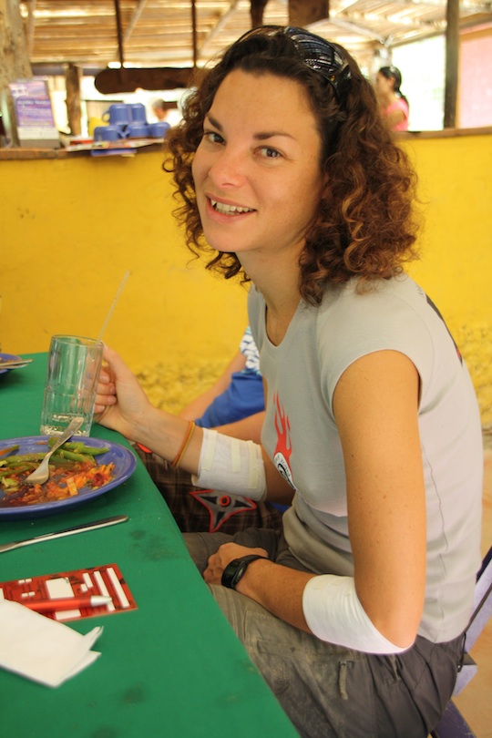 As we enter the Amazon basin, the road flattens out and widens. Banana trees line the route and small houses with fruit gardens. People are carrying loads, dogs run out: new hazards to negotiate. But in some parts we have to pedal now, when the road briefly climbs, making me far happier. The final few kilometres are wider and more gently downhill and it is here – thankfully far from the kilometre-high cliffs – that I tumble. My back wheel spins off on a rock, I panic, brake too hard and fly over the handlebars, grazing my elbows and knee on the rough road. There’s blood but not much, terror but no tears. I get back on and we head off down again. (At our hostel, we meet a poor lad who suffered the same accident, only he broke his collarbone in 5 places and his arm, so I was very lucky.)