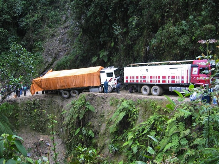 The single-lane highway, which averages just 3 metres in width, drops steeply from 4700 to 1200 metres over less than 50 miles and is a poorly maintained path of hairpin bends that wind along the mountains, featuring vertiginous drops of 800 metres or more. Buses, too long to make the tight turns, have to reverse up in 3-point turns, with their rear ends hanging terrifyingly over the edge.