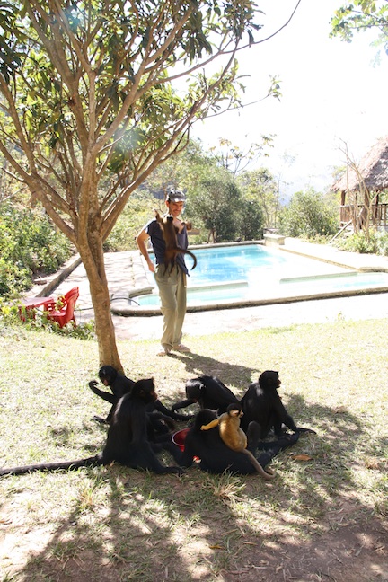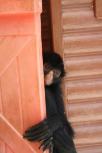 It’s a pretty incredible sight. Vicky, me and the couple of European volunteer workers become human props to be scrambled over or surmounted for a better vantage point. The labrador seeks short-lived refuge between Vicky’s legs and a domestic cat slinks past, hissing at curious monkeys in its path. A spider monkey hangs off Nick, pulling faces and generally showing off, making everyone laugh.