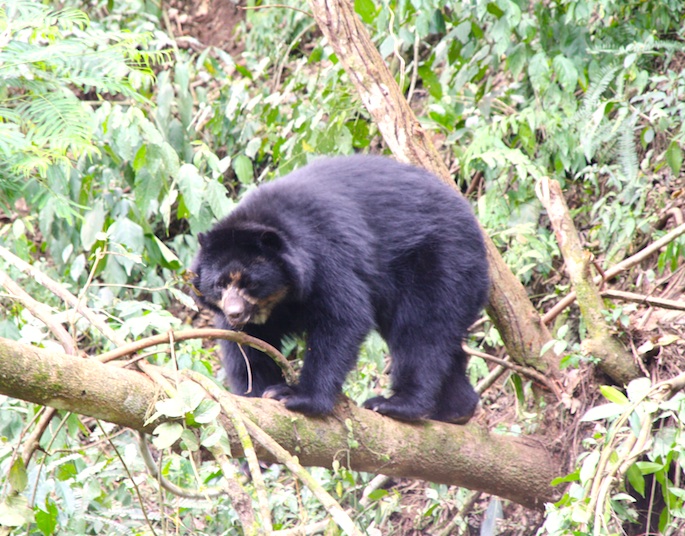 Crossing a stream, we reach Vicky’s 3000 square metre, spectacled bear enclosure. Inside, the big, 120 kilo Andean bear lumbers around playfully, chasing sticks and eating corn.