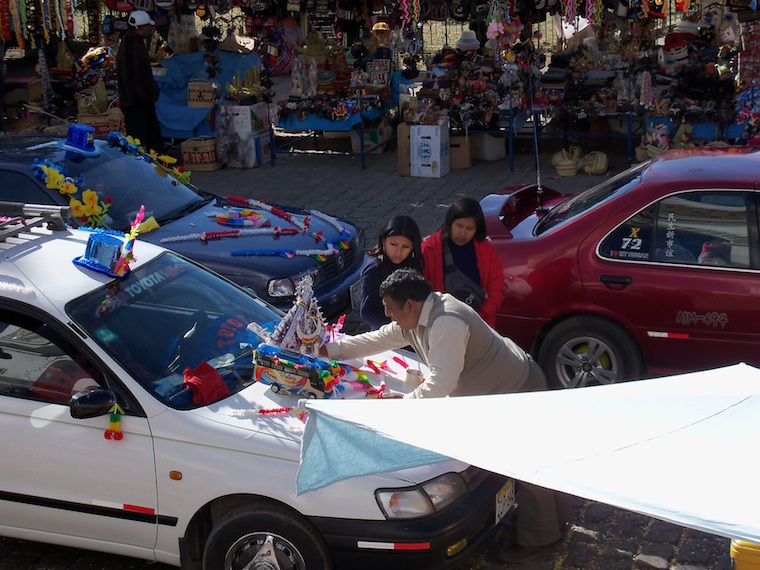This is also the time of Benedicion de Movilidades, a bizarre ritual that involves car, truck, bus and bike owners coming from as far afield as Cusco for a priest blessing outside the cathedral. The line up of vehicles is miles long and each is decked out in party tinsel, paper decorations and their hopes and dreams in miniature kitsch form – this means that car and truck bonnets have a toy bus stuck on them (if the owner is hoping to go on a long-distance bus journey), a doll’s house (if the owner aspires to a new house), bunches of paper money, etc.