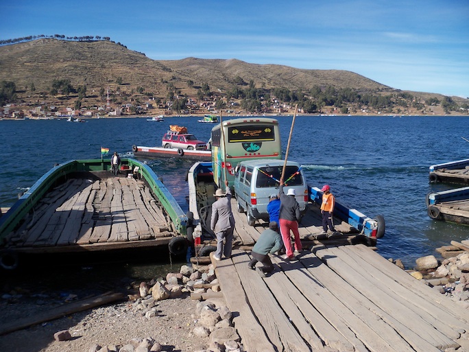 To get to the pretty lakeside town of Copacabana (afterwhich the more famous Rio beach was named) we have to cross the lake’s Straits of Tiquina. We climb off our bus and take a small, overcrowded motorboat across and wait on the other side for our bus, which, like all the other vehicles, has to embark a dodgy looking raft of swaying timbers.