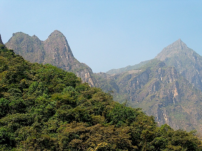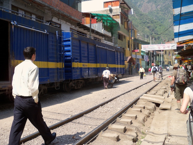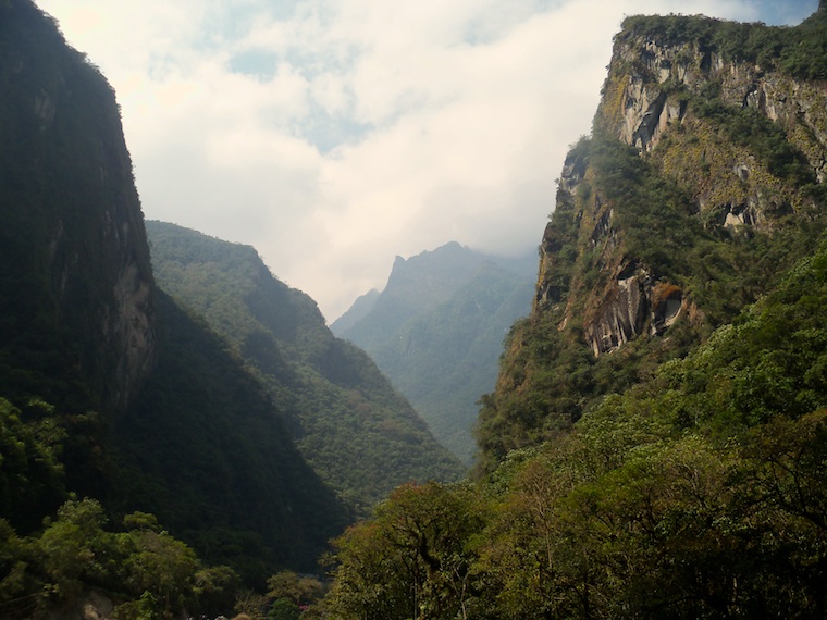 We walk for several kilometres along the railway line that follows the Urubamba River, rounding the Machu Picchu (‘Old Mountain’) mountain, but failing, as the Spanish did, to glimpse the famous ruins high above us.