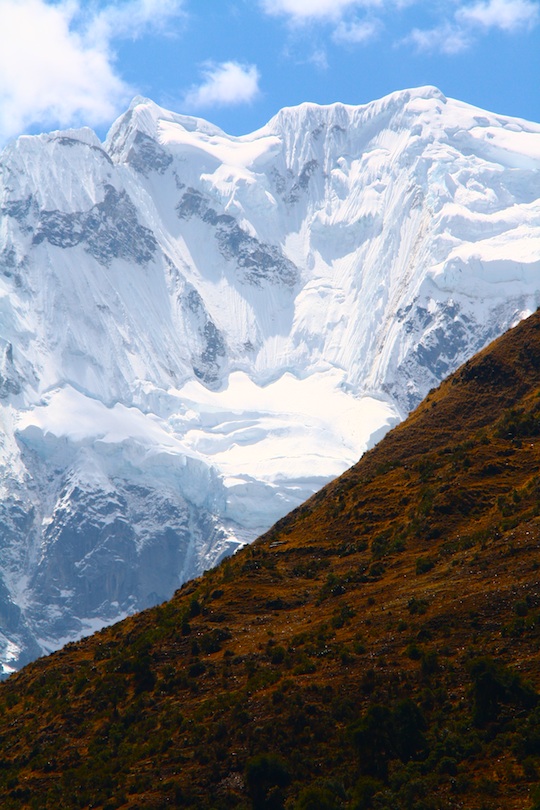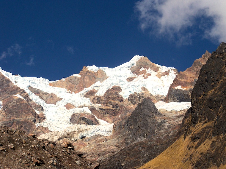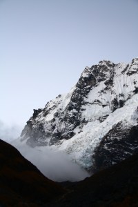 Next day, we climb slowly to the pass, standing between glaciers – or what remains of them after global warming has shrunk their whiteness. Edwin tells me that 10 years ago, all the mountains we stand among were white, and that the river ran far stronger and fuller. In 1998, a huge chunk of the Salkantay glacier collapsed causing glacial outwash floods that killed dozens, washed away hundreds of homes and shutdown the hydroelectric station further down. The Salkantay glacier is retreating at a rate of 1.02 km per year, with a third of it gone since 2003.