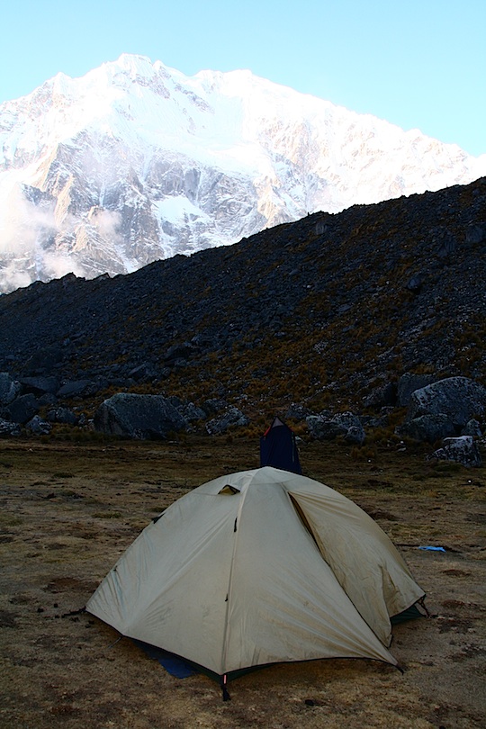 After lunch, it’s a different story. The path winds steeply upwards towards the 4700-metre-high Salkantay pass. To one side, the white peak of Salkantay (meaning ‘The Savage Mountain’ in Quechua) soars in a wall of ice and snow, 6271 metres up. To the other, the dusty rock mountain begins to conceal the sinking sun. We’ve rented walking poles for the first time and I stab ahead at the hard rock, gasping in the thinning air, feeling like a cross between my grandmother and a wildly flailing spider – not, as I’d hoped, a super-efficient German alpine trekker.