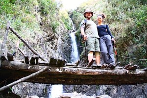 At dawn, we set off for the lower valley, descending into humid rainforest of vines and hardwood. Waterfalls rush down the mountainside and the path becomes wetter and more precarious. Tree trunks are spread across places where the path vanishes due to landslides or erosion and we cross them carefully on wobbly legs. In time, we reach the river, where cows graze and crop plantations regularise the landscape.