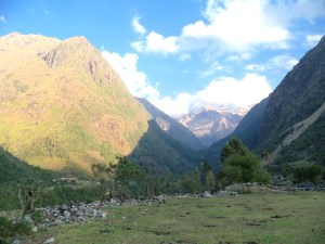 We drive a short distance – the Incas knew about the wheel but only used it for children’s toys, perhaps, archeologists speculate, because the large boulders they needed to move could not be supported on axle constructions and had to be rolled – and then, where the road peters out, we begin the slow march into the Cordillera Vilcanota. The day is warm and bright, hot air rises on the hum of insects from the valley below and, ahead, the sharp white peak of Salkantay cuts the sapphire sky.