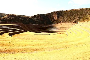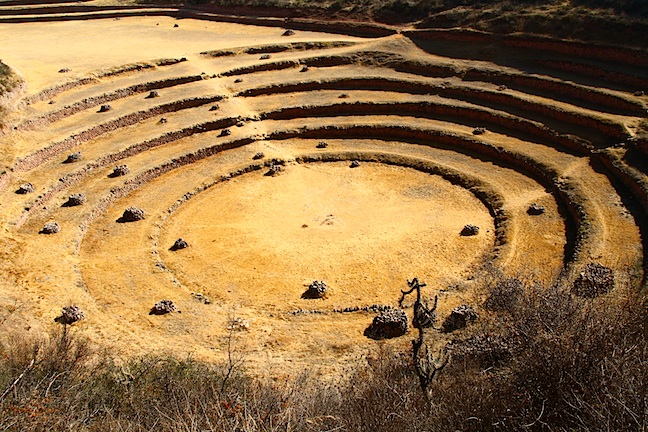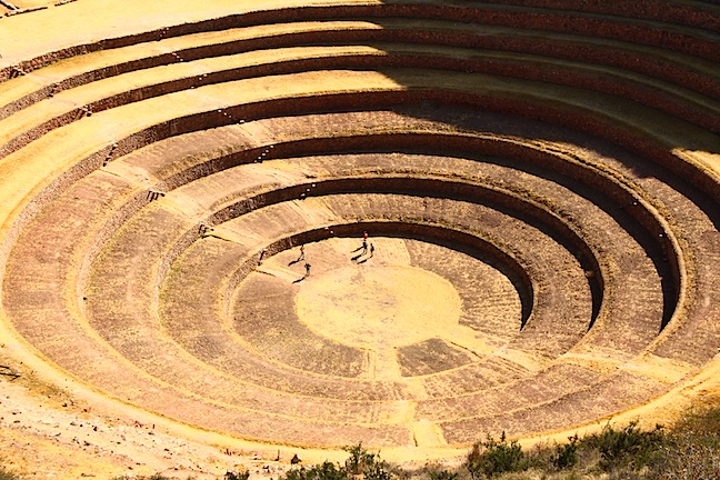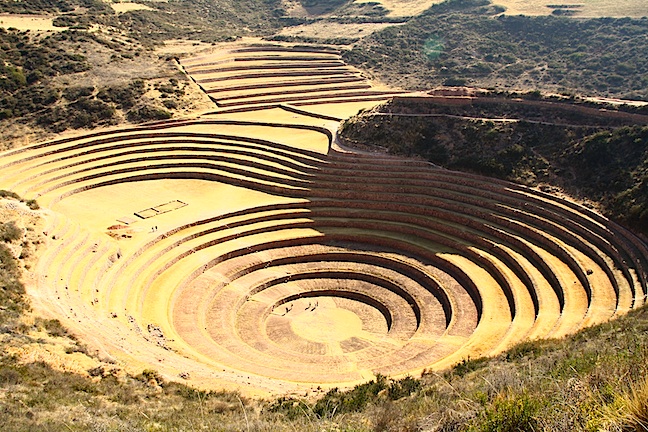 Called the Moray, these regularly terraced areas, which descend in concentric circles of carefully built stonework, are agricultural breeding and test laboratories. They were built more than a millennium ago by people who took advantage of natural dips in the landscape here to experiment with different temperature and altitude conditions.