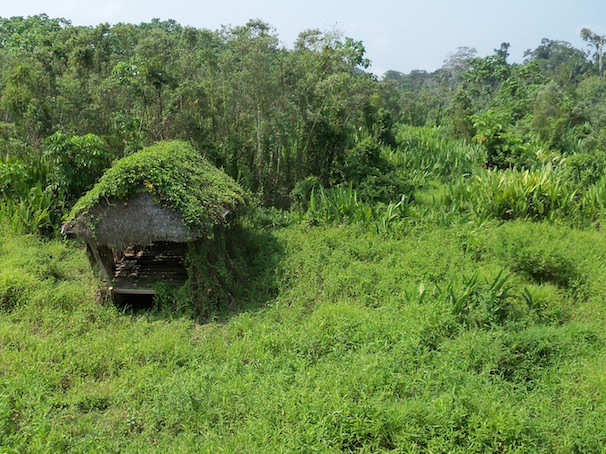 Before long, we have reached the heat, humidity and intense green foliage of the rainforest proper. The trouble with travelling through rainforests is that it involves leaving the world we have so perfectly ordered around we nice clean humans. We become, on entering a rainforest, just another ill-prepared piece of flesh wandering around for anything to take bites out of, inhabit or incubate their eggs in. We are soon bitten to swollen lumps by mosquitoes, blackfly, sandflies, horseflies… Malaria is not a big problem here, but botfly, leishmaniasis and other troubles too horrible to go into are. We spray DEET with the thoroughness of a 17-year-old boy with aftershave on a first date, but still they bite us.