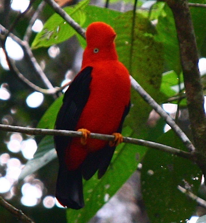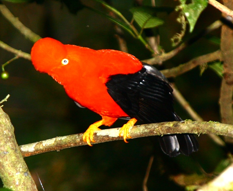 Waterfalls, mosses, lichens and a plethora of orchids bring us into cloud forest, which here is home to a ‘lek’ (regular bird gathering) of Peru’s national bird, the bizarre, charismatic cock-of-the-rock, or tunqui, a bright amber bird whose eyes seem to be planted halfway up its neck, giving it the appearance of being more brainless than other birds. They dance impressively for us – well, actually, for the females; it’s mating season – and call out with an ugly chicken-like noise.