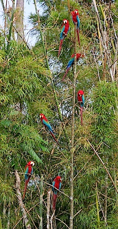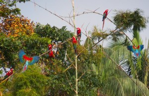 We head down river from the upper Rio Madre de Dios to the greater Manu river in a canoe that requires heaving over the riverbed every now and again due to the low water level. Along the way, we spy cormorants, colourful yellow ‘oro pendula’ birds that weave hanging nests, turtles and herons. We overnight in a series of forest lodges and the Manu park’s only tented site (owned by Walker) and rise early to visit a high bank of clay visited by hundreds of squawking macaws and parrots. It’s an impressive sight: a blast of colour and sound, with my favourite being the scarlet macaws. These monogamous birds arrive in pairs or in threes (son or daughter in tow) to the lick, where they hang on to the wall and seem to manage to eat and shout at the same time.