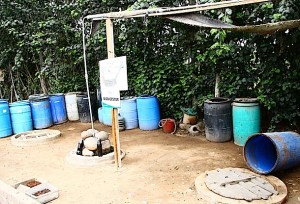 The bio-digester. Poo goes into the right-hand hole, biogas rises from the middle hole and the left-hand one produces the liquid plant feed