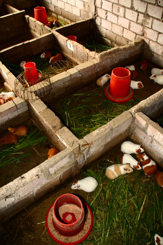 Taking up one wall of their plot is a low-roofed shed housing almost 1000 guinea pigs (Carvia porcellus) in numbered, regularly compartmented enclosures. They burble and chatter, whistle and purr as they eat their specially enriched food of plant waste matter.