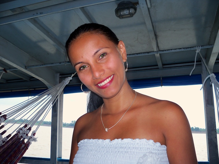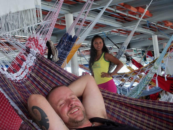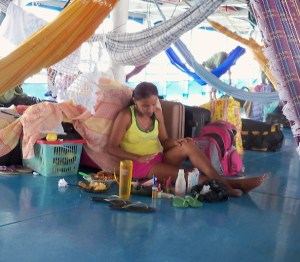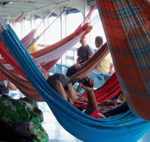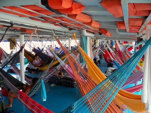 At the port with our bags, there’s a delay – the boat’s not leaving till 3pm. We sit down, only then realising that the other passengers (we are the only gringos), are mostly stunningly attractive young women wearing approximately nothing. Nick’s eyes are popping out of his head at all this beautiful flesh. I punch them back in and make him focus on the job in hand: securing a place in the queue. Our bags must be positioned in line, so that when we get onto the boat, we get a good hammock space.