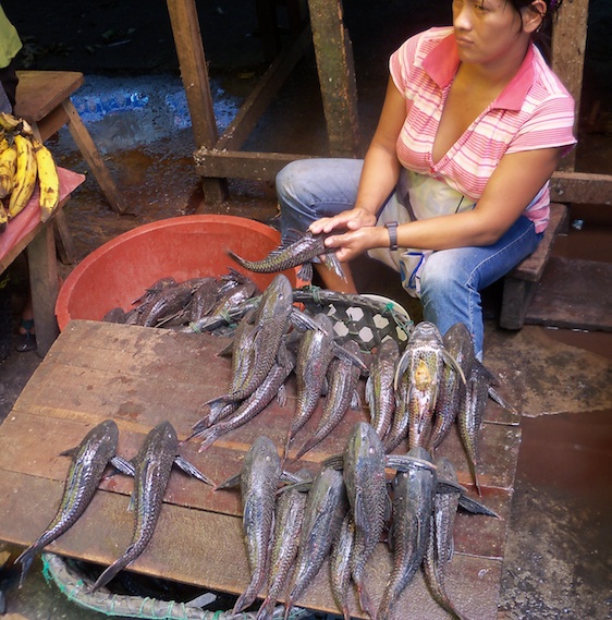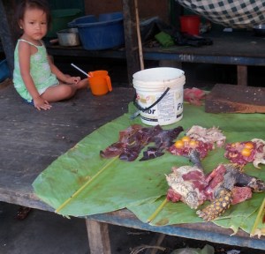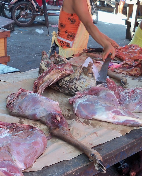 We visit Belén, a stilted slum district and floating market (sometimes compared to Venice!), once home to the jungle tribes that were captured and enslaved here to work on the rubber plantations. We find it not floating but standing high and dry. The Amazon river is at its lowest level for 40 years. Large cruise liners and other boats are stranded in a sea of grass, others are stuck in the sand on the riverbed.