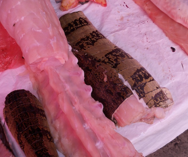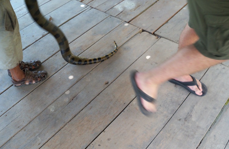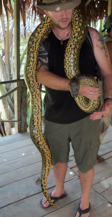 The market displays the usual horrifying jungle ware of every forest animal. It’s sad to think that the only time I’ve seen some of these animals, like armadillos, is when they are sliced up on a market stall. We leave the sorry scene and take a small boat to a butterfly house and animal rescue centre. On the way, our boatman asks if we’d like to visit the serpentarian, where they have an anaconda. It’s part of the rescue centre, he tells us.