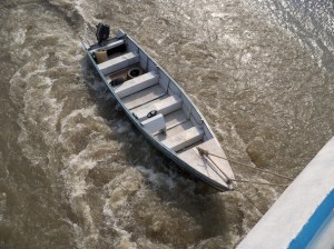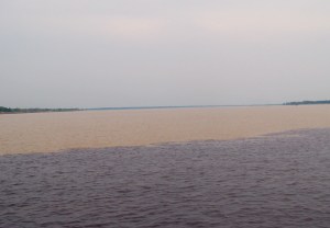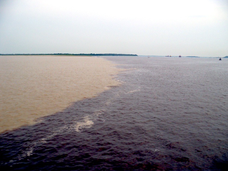 I am diverted from my humiliations by the incredible Meeting Of The Waters: a merging of the pale, café au lait river that we’re on and the swirling black waters of the Rio Negro. Under us are manatees, river dolphins, perhaps even bull sharks.