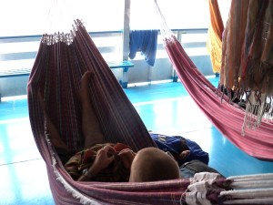 Our world is reduced to an open hall of swinging hammocks. We lie back and admire their many colours and designs. Some have pretty lace sides, others have interesting weaves. We watch the people in the hammocks. Some are swinging, from some a shapely leg dangles, others cocoon sleeping bundles, in some, a wild dance of flailing limbs goes on – they are the ones holding children.