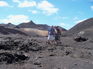 From our high vantage point, we can see that the barren lava stretches to the sea. In time, microorganisms will colonise this rock, holding the powdery lifeless crystals together long enough for lichens and cacti to get purchase. Eventually, there will be some sort of soil here and vegetation, like on the older islands we have seen.