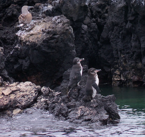 As we enter the main port, a small bay whose reef makes it only navigable at high tide, we see several penguins diving like aquatic mammals in the water, while others stand stiffly to attention on the rocky lava.