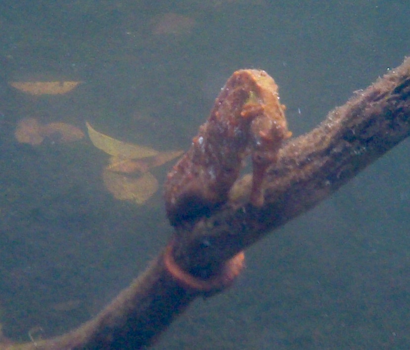 We enter a shady mangrove area and Juan motions for me to quietly approach. On a branch, with its tail wrapped firmly around, is a large male seahorse. He is perfect: his belly pouch fat with babies and his fins pressed neatly back. We watch him for a while, before Juan points out a female wrapped on a nearby stem. She is a darker, smaller and more slender version of the male, and just as beautiful.