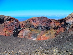 We decide to visit the nearest volcano – of the 2005 eruption – and walk for 10 kilometres along its enormous crater rim. The crater is huge: 12km by 8 km. The path is thick with dust. It covers our legs and clothes, seeps into every crease and fills our noses. In time, the desert scrub peters out, leaving just the hardy cactuses, until that too ends. Finally, there is nothing. The crater is as the island must have been soon after its emergence – after the earth vomited up this multi-coloured rock from beneath the Pacific Ocean. Metals in the black lava reveal themselves in gold or red flashes. There is the brightness of sulphur, accompanied by its smell, and the white powder of ash.