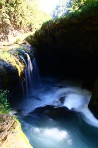 In the morning, we walk a few metres down a jungle path to find the big attraction. Its a truly beautiful limestone bridge that buries the fast flowing River Cahabón, which then re-emerges 300 metres downstream.