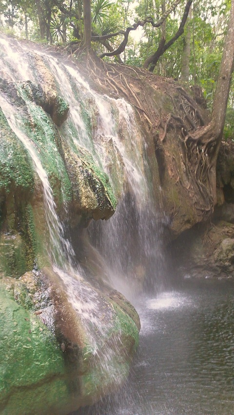 The hot springs tumble 12 metres down over us and into the cold water pool, where a variety of fish peck at our legs, attacking mosquito bites and freckles they mistake for food. The rocks are coated in a strange amorphous yellow and green minerals, where the sulphur has crystallised out.