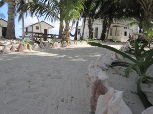Tourist cabins built by Gerald on Tobacco Caye. Discarded conch shells are used to decorate everything.