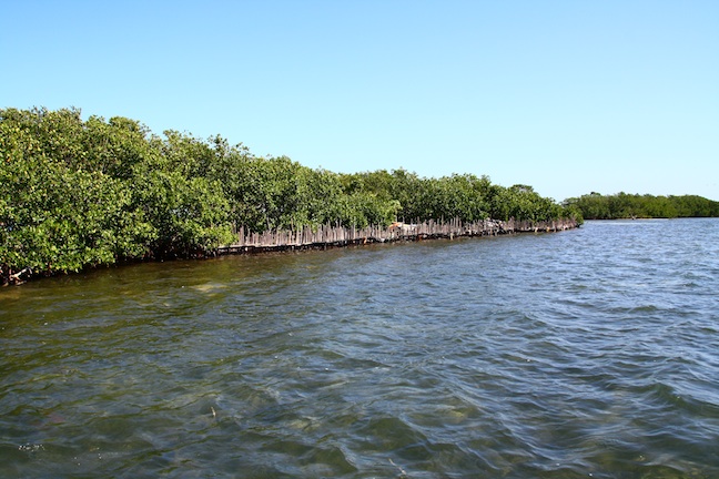 The new island is hemmed in with fencing and mangroves