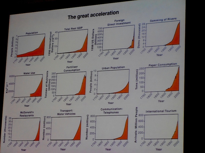 As the scientists of the working group stood in front of their slides – all of which showed graphs whose lines went from Holocene-stable flat, sharply rising towards the vertical after the 1950s – the message was clearly stated: humans have so changed the planet that our effects will be seen in the fossil record as far away as 10 or even 100 million years time. Millions of years from now, alien geologists would be able to make out an Anthropocene stripe in the accumulated layers of rock in the same way that we can see the dinosaur prints of the Jurassic, or the explosion of life that marks the Cambrian.