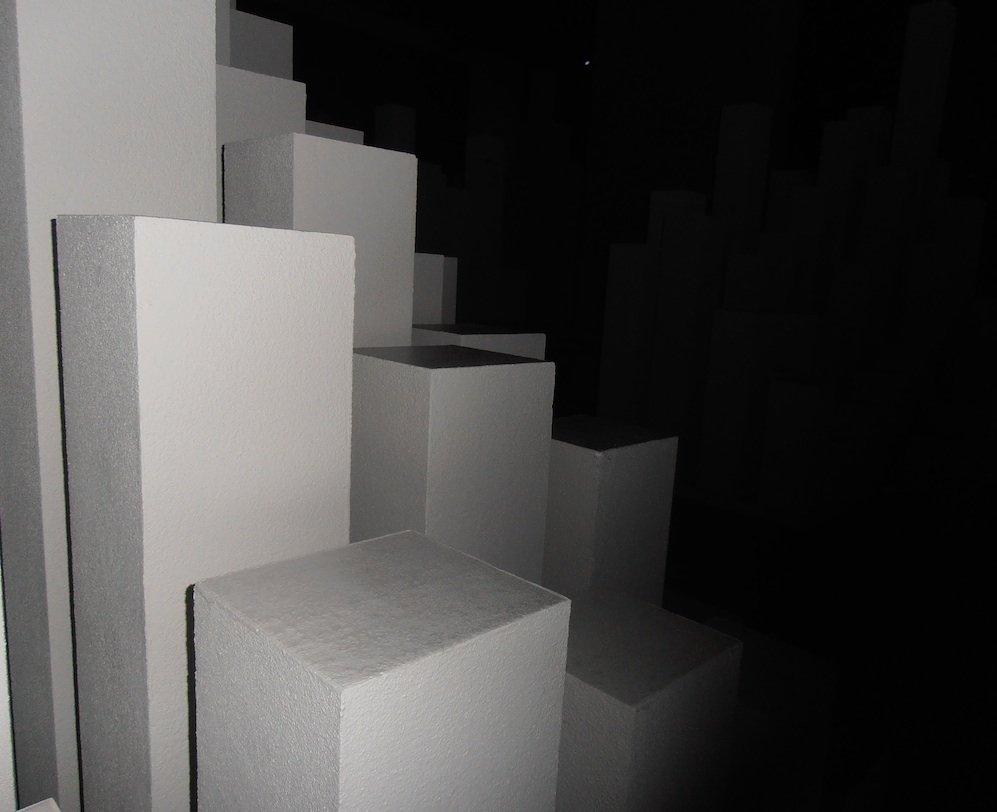 We enter a darkened room – a twighlight world of strange Polar light – clutching our UV torches to navigate the many ‘ice-stacks’ that fill the landscape. Each stack is inscribed with a name that is only readable by torchlight, and that is the only reading material. The exhibition is set in 2100, and as we explore the piles of ice, the disembodied voices of previous Arctic explorers fill our ears.
