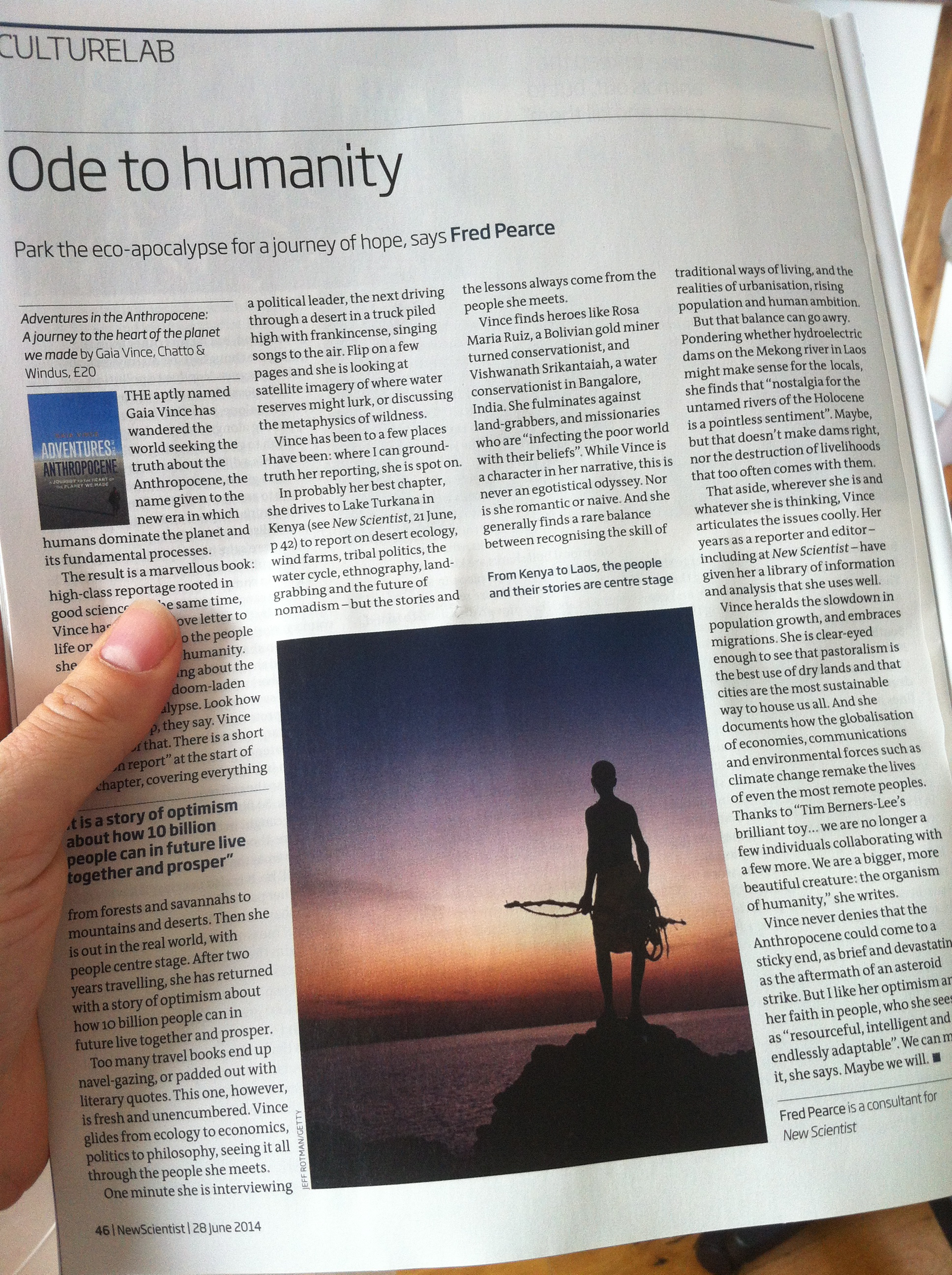 Posted on June 26, 2014September 27, 2019 by Gaia New Scientist review Really lovely review of my book by Fred Pearce today, describing it as “an ode to humanity”! Share this: Click to share on X (Opens in new window) X Click to email a link to a friend (Opens in new window) Email Click to share on Reddit (Opens in new window) Reddit Click to print (Opens in new window) Print Click to share on Facebook (Opens in new window) Facebook Like Loading... Related