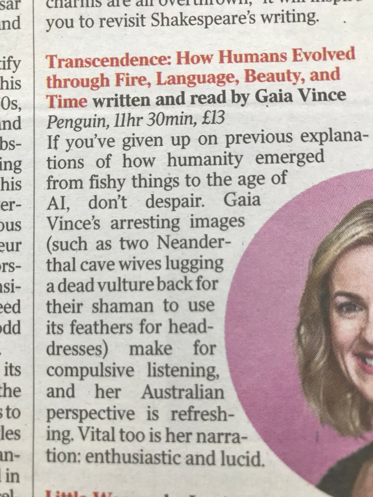 I’ve started doing some talks around my book, and received some more lovely reviews. And I’m thrilled that TRANSCENDENCE has been chosen as a book of the year by The Times and the Daily Mail, and as an audiobook of the year by The Times: