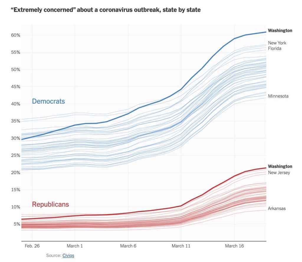 Only up to a point. This stark dataset from surveys of the American public, reveals that attitudes to the same fatal virus in the same nation depends on how they vote. Republican voters are generally far less concerned about COVID-19 than Democrats.