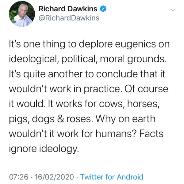 by Gaia Posted on February 17, 2020February 18, 2020 No, Richard Dawkins, eugenics would not work in humans like it does in cows and pigs Read More
